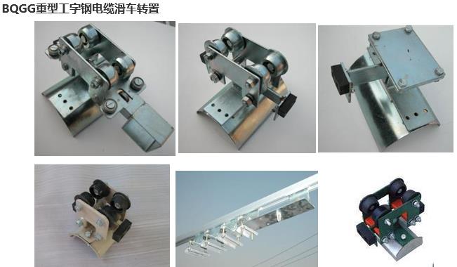 GHC型工字鋼電纜供電系列由牽收引滑車(chē)、電纜滑車(chē)、終端滑車(chē)三部分組成,牽引滑車(chē)跟隨移動(dòng)機(jī)械導(dǎo)纜(牽引)裝置,每個(gè)移動(dòng)機(jī)械配1個(gè),隨移動(dòng)機(jī)械往返運(yùn)行。中間電纜滑車(chē)將電纜懸掛在工字鋼軌道范圍內(nèi)隨牽引滑車(chē)移動(dòng),兩端并裝有緩沖撞頭,滑車(chē)視移動(dòng)長(zhǎng)度不同而定數(shù)量。終端滑車(chē)固定在工字鋼導(dǎo)軌末端,一般每個(gè)移動(dòng)機(jī)械設(shè)置1個(gè)。首端為電纜牽引車(chē),終端為固定掛線架,中間為電纜滑車(chē),該系列滑車(chē)分Ⅰ、Ⅱ、Ⅲ、Ⅳ、Ⅴ五種型號(hào),如用戶(hù)采用12#、14#、16#或更大號(hào)數(shù)工字鋼,可在訂貨時(shí)注明,本公司可成套供貨。