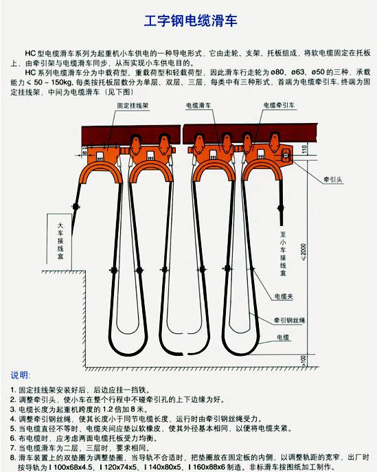 該系列滑車分Ⅰ、Ⅱ、Ⅲ、Ⅳ、Ⅴ五種型號,工字鋼電纜滑線如用戶采用12#、14#、16#或更大號數(shù)工字鋼,可在訂貨時(shí)注明,本廠可成套供貨。