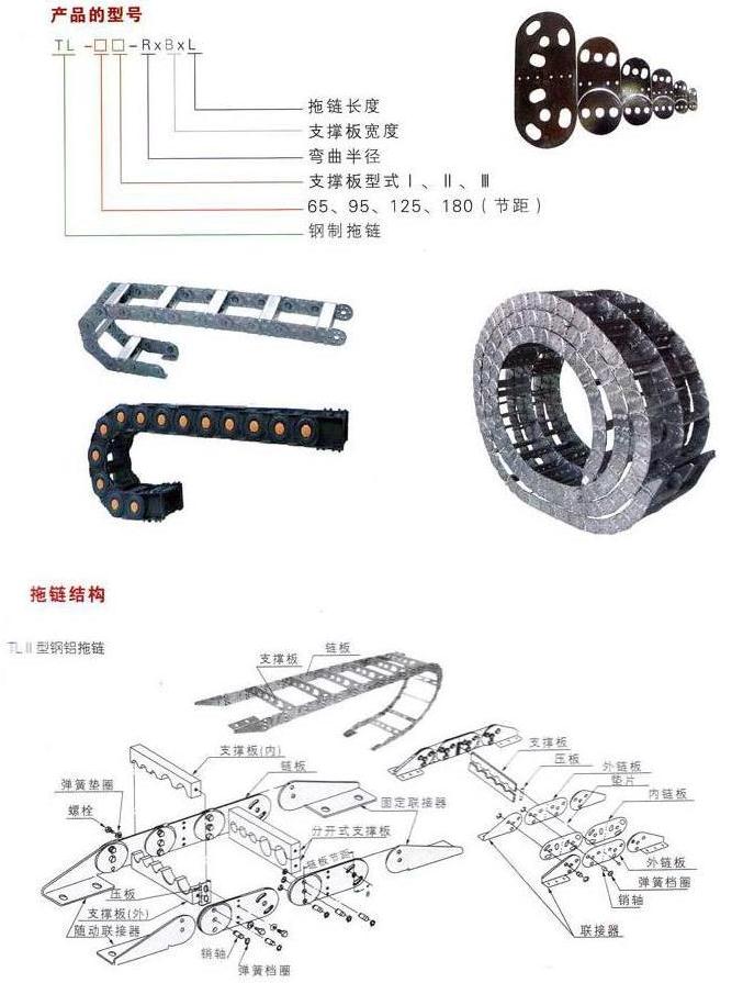 TL系列鋼制電纜拖鏈,銷軸及支撐板和隨動連接器等零件組成。拖鏈可適用最大移動速度為40米/分,拖鏈安全使用壽命不少于100萬次(往復(fù))。該產(chǎn)品具有設(shè)計(jì)精巧、使用靈活等特點(diǎn),被廣泛應(yīng)用與冶金、鋼鐵、鑄造、大型機(jī)械等行業(yè)作為短距離,油、氣、水軟管和電纜同時移動之用。